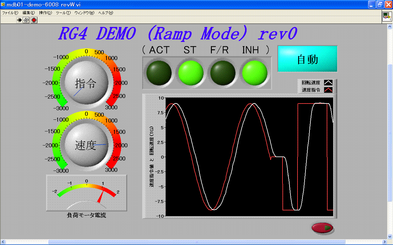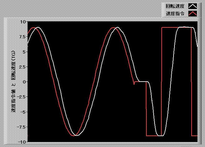 | 赤線 指令電圧入力波形 白線 RG4動作波形 正弦波入力した指令電圧に対してモータの回転速度も正弦波を描いて動作している事が確認できます。モータが回される負荷に対しても制御できます。この波形は負荷の変動が起こった際にも乱れません。 多彩な指令入力に対して素直な反応を示す為、様々な運転条件に対応できます。 |
